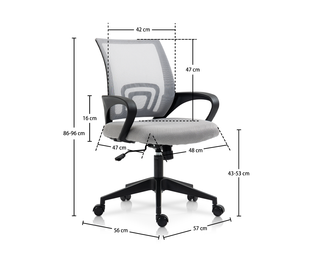 • ধূসর জাল অফিস চেয়ারটি আরাম এবং শৈলীর নিখুঁত ভারসাম্য। একটি আধুনিক এবং ক্লাসিক ধূসর জাল ব্যাক সহ যা শ্বাস প্রশ্বাসের জন্য অনুমতি দেয়, আপনি কাজের দিনগুলির ব্যস্ততম সময়েও শীতল থাকতে পারেন।